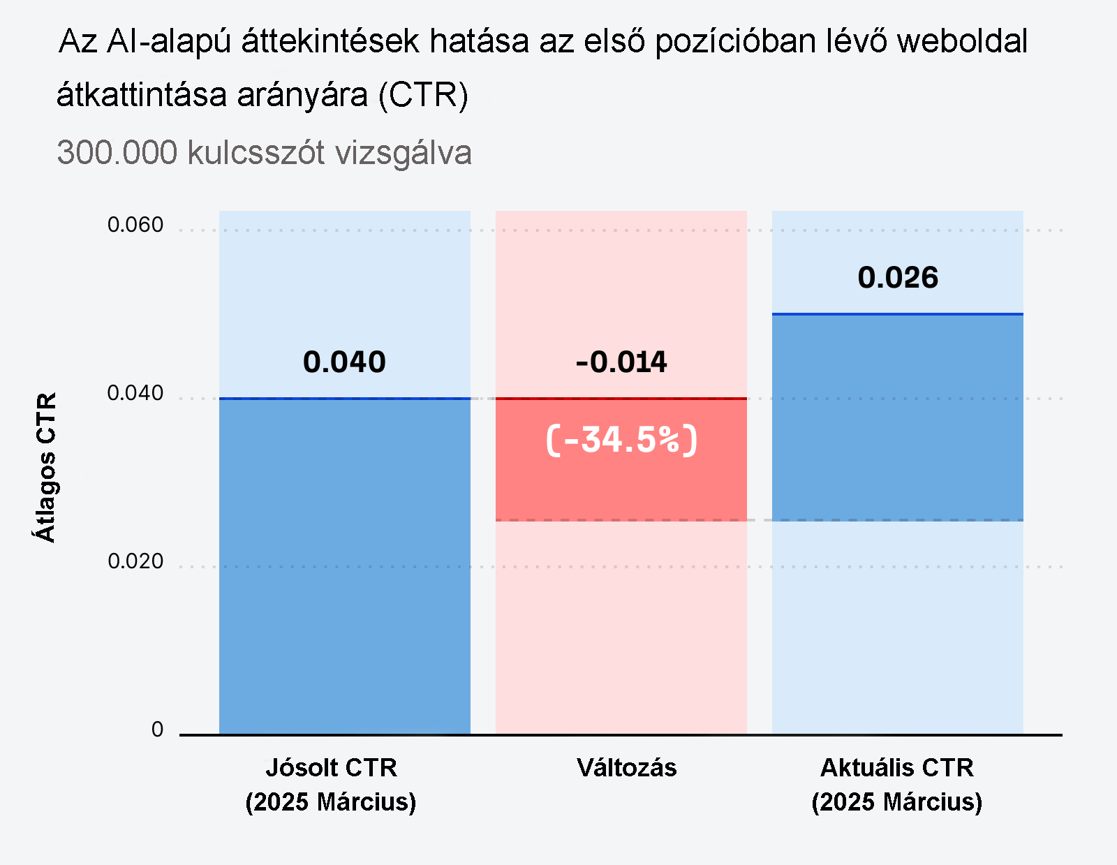 Az AI Áttekintés kulcsszavak előrejelzett és tényleges CTR-je közötti különbség kiszámítása azt sugallja, hogy az AI Áttekintések jelenléte ~34,5%-kal csökkenti az 1. pozíció átkattintási arányát ((0,026-0,040)/0,040):
