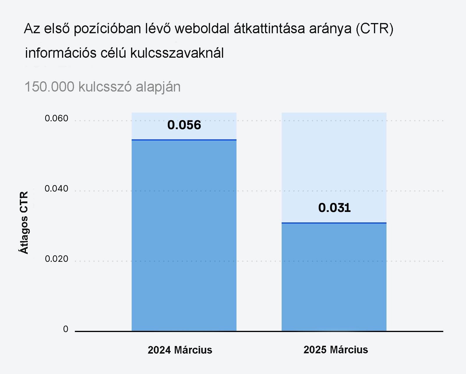 2024 márciusában az információs kulcsszavak átlagos pozíciónkénti CTR-je 0,056 volt. 2025 márciusában ez 0,031-re csökkent: